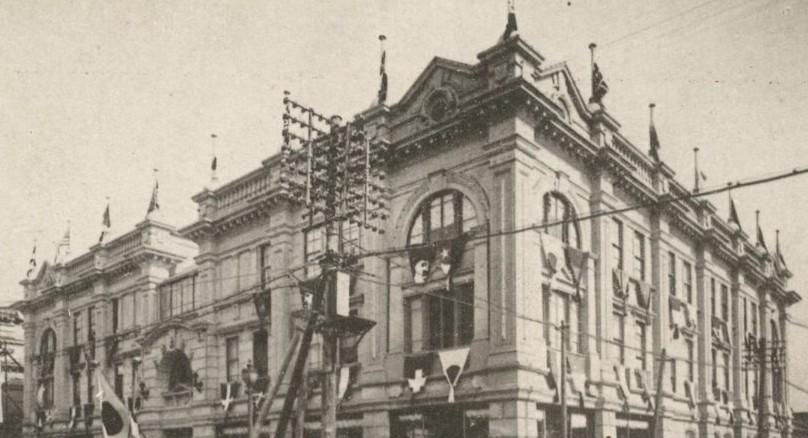 Although the photograph is small and in black and white, it is still possible to make out, with some degree of certainty, some of the flags. The ones somewhat discernible from left to right on the bottom are Switzerland, France, Italy, Japan, Sweden or Denmark, and Monaco. Above them but still hung off the edifice of the building are what appears to be the flags of Chile, Poland, Belgium, and Spain. At the very top are the flags of the United States of America, Great Britain, and probably another Japanese flag but it is difficult to tell. Even if my flag guesses are imperfect, it is abundantly clear that this department store has gone to great lengths to include the flags of numerous countries from all over the world so that current visitors feel welcome and those receiving the postcard would be inspired to come and visit. (Sally O’Keeffe)